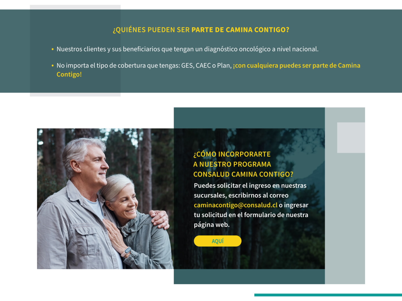 Es por esto que el Programa Consalud Camina Contigo, nació con el propósito de apoyar a nuestros clientes con diagnósticos oncológicos, con un modelo de atención preferente, diferenciado e integral para contribuir a transitar este proceso de una manera más amable y cercana.