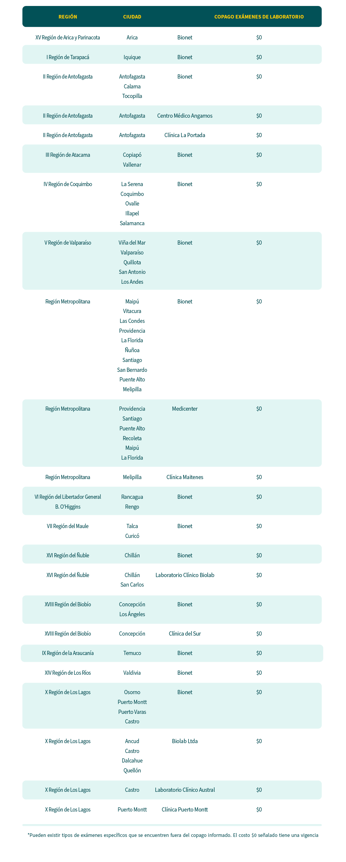 (*) Pueden existir tipos de exámenes específicos que se encuentren fuera del convenio costo $0. Todos los convenios están sujetos a cambios.